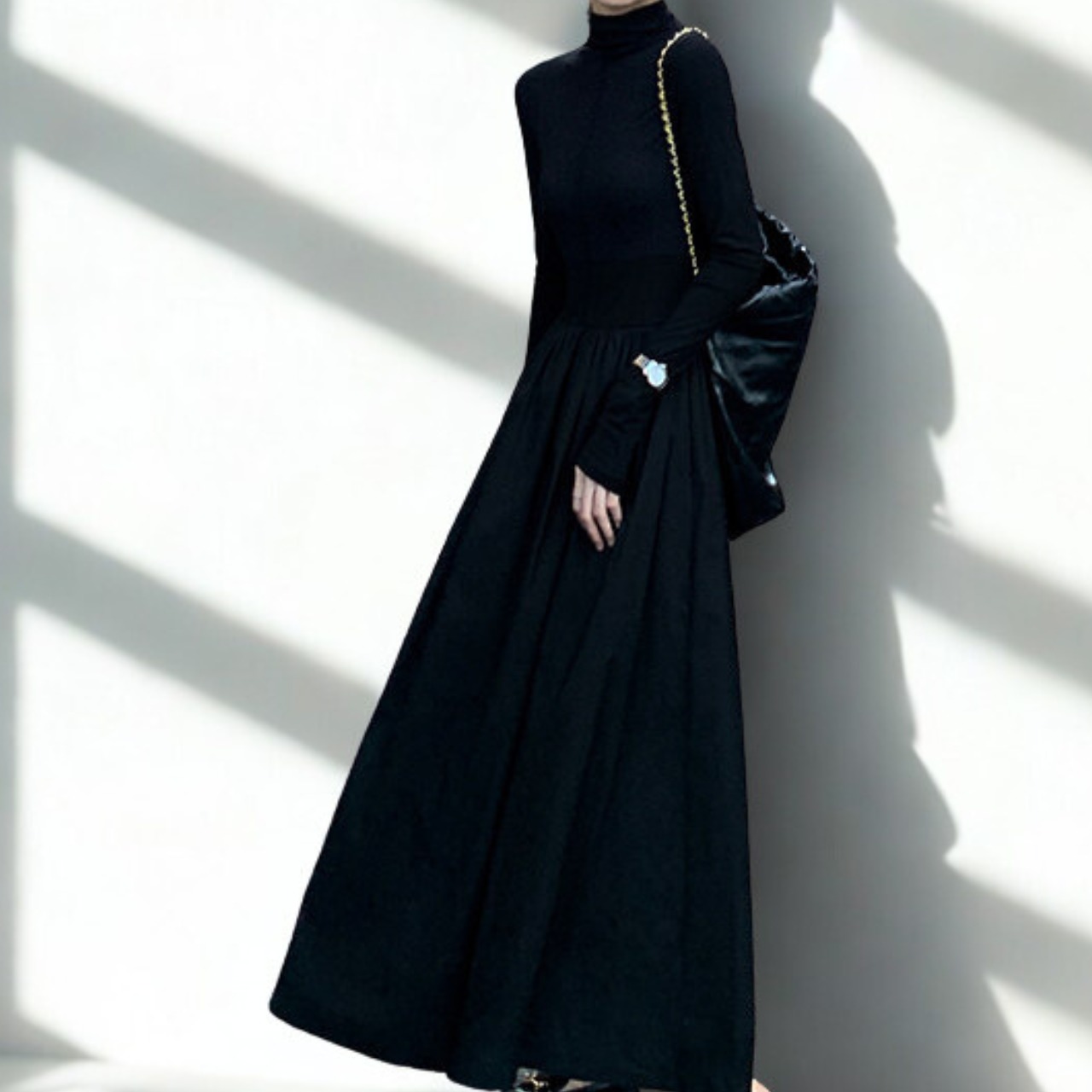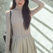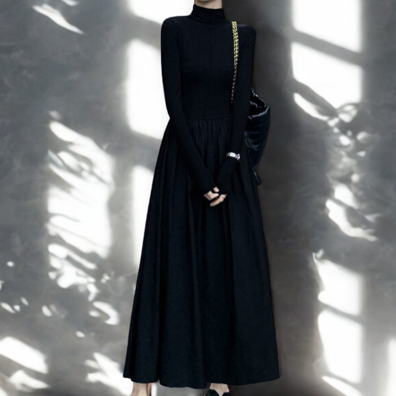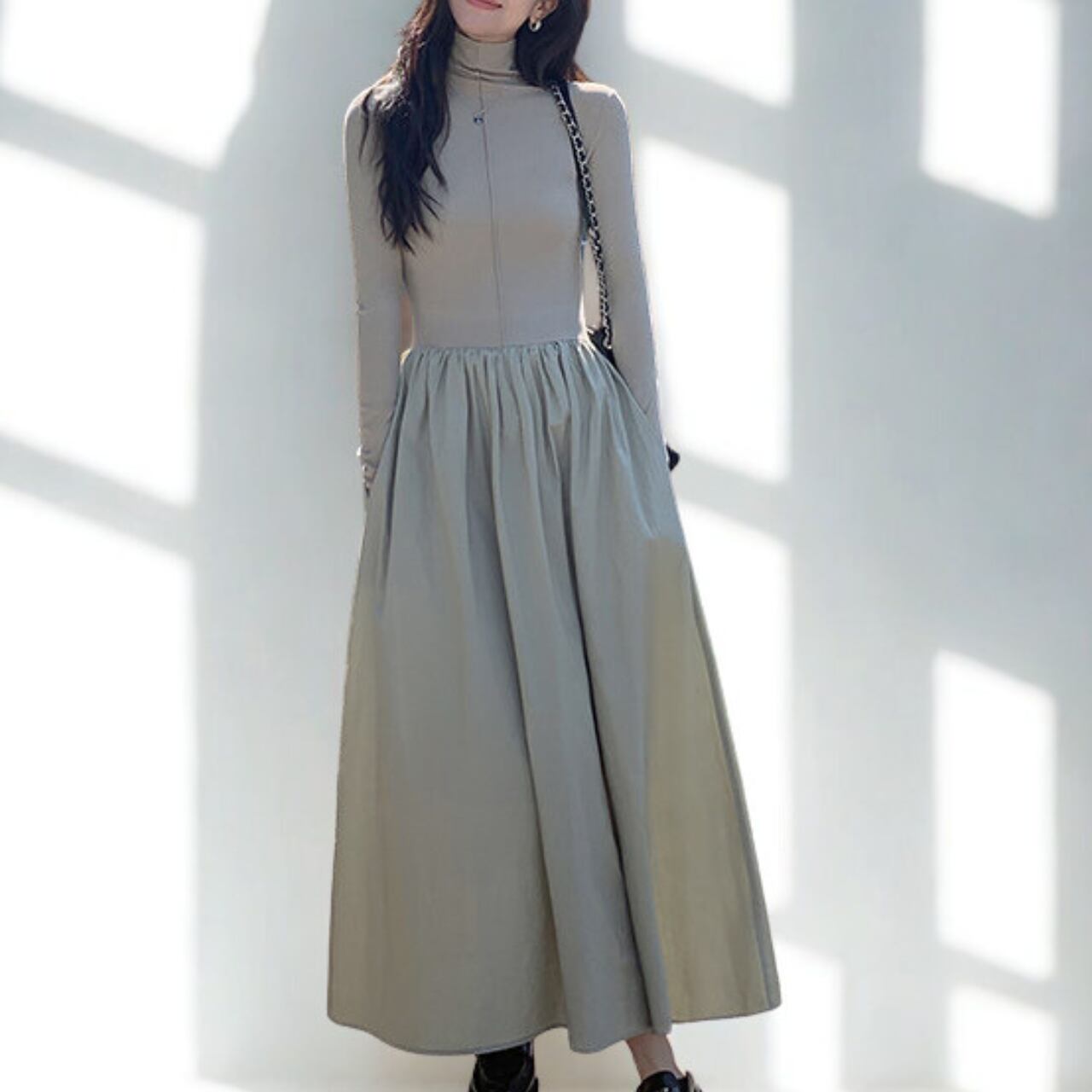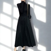 00025 ジッパーネック 長袖 ロング丈 Aライン ワンピース