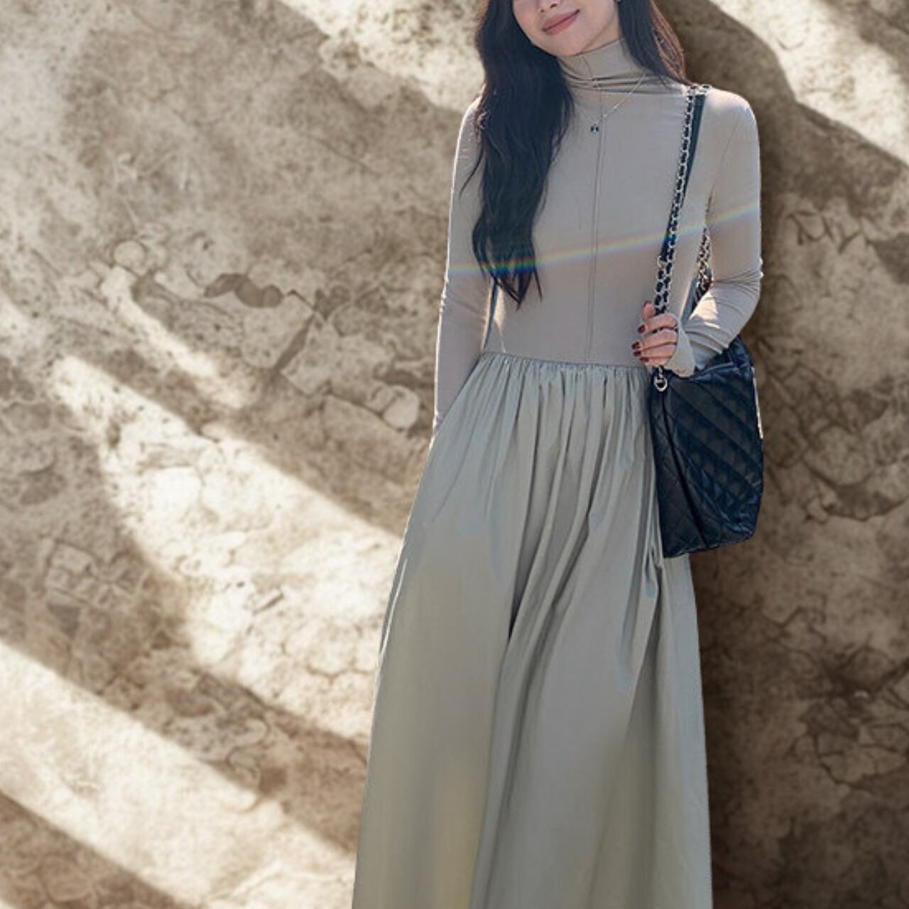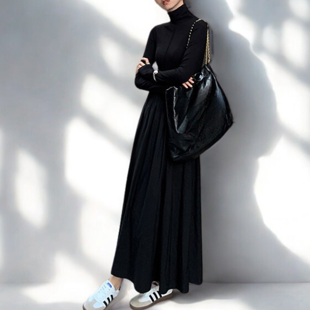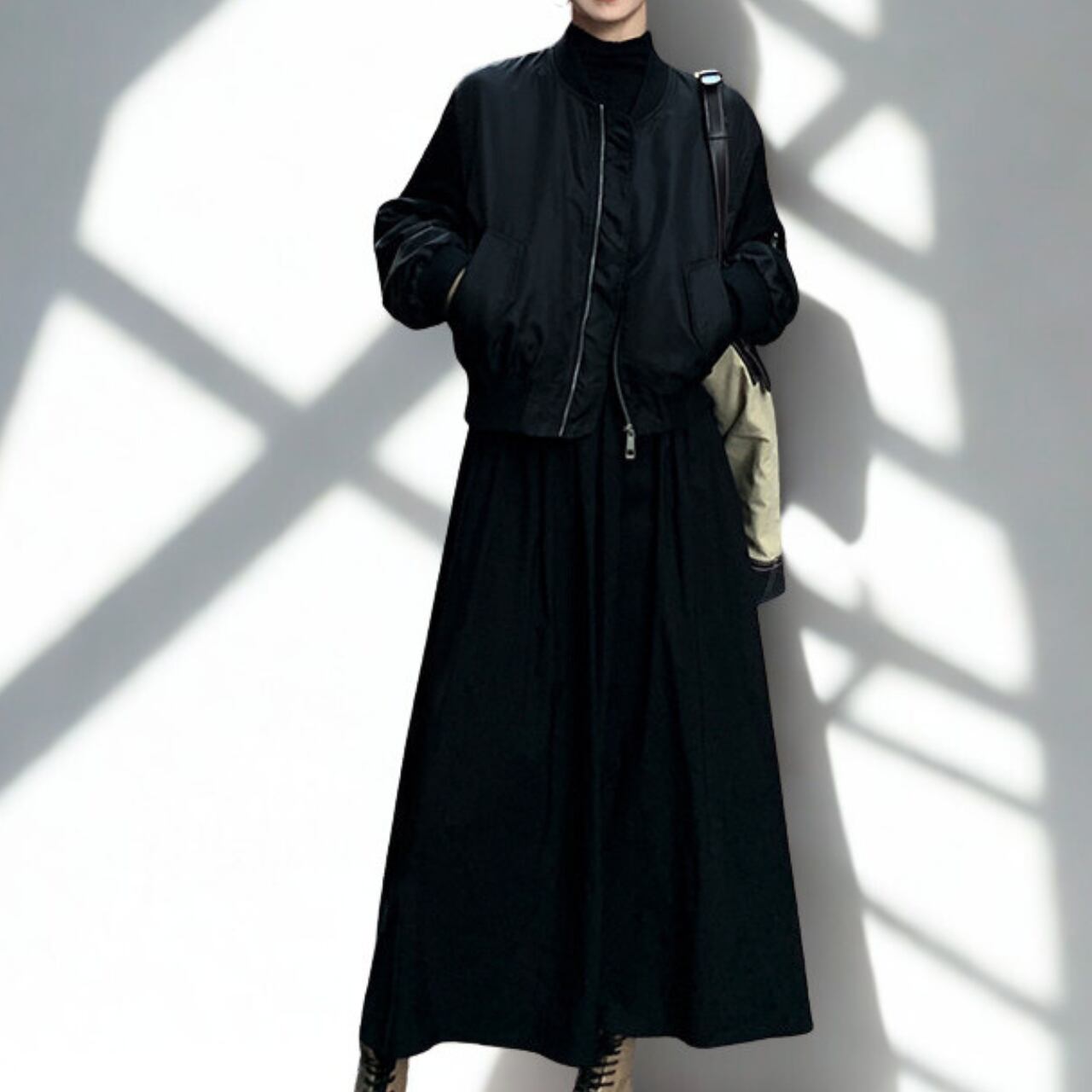 00025 ジッパーネック 長袖 ロング丈 Aライン ワンピース