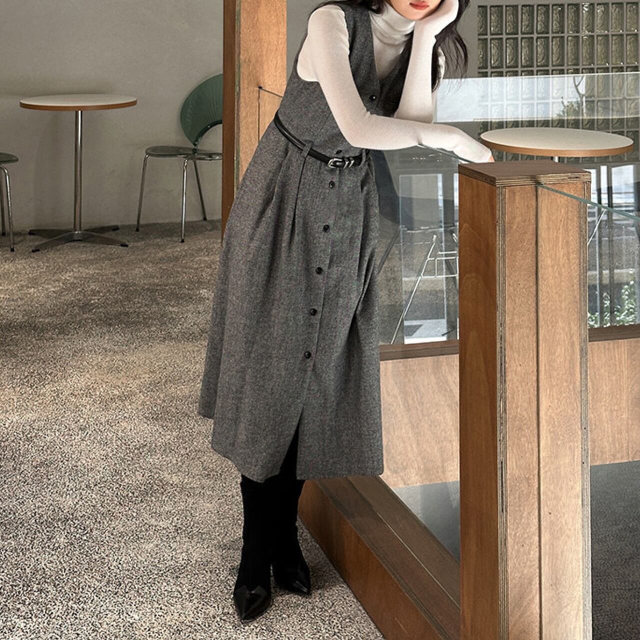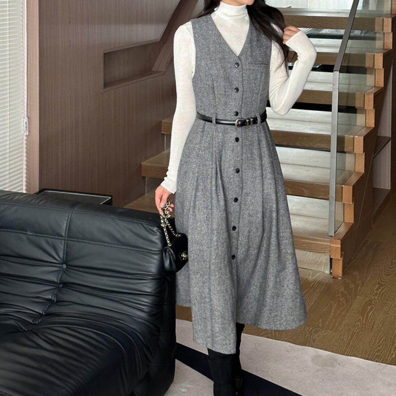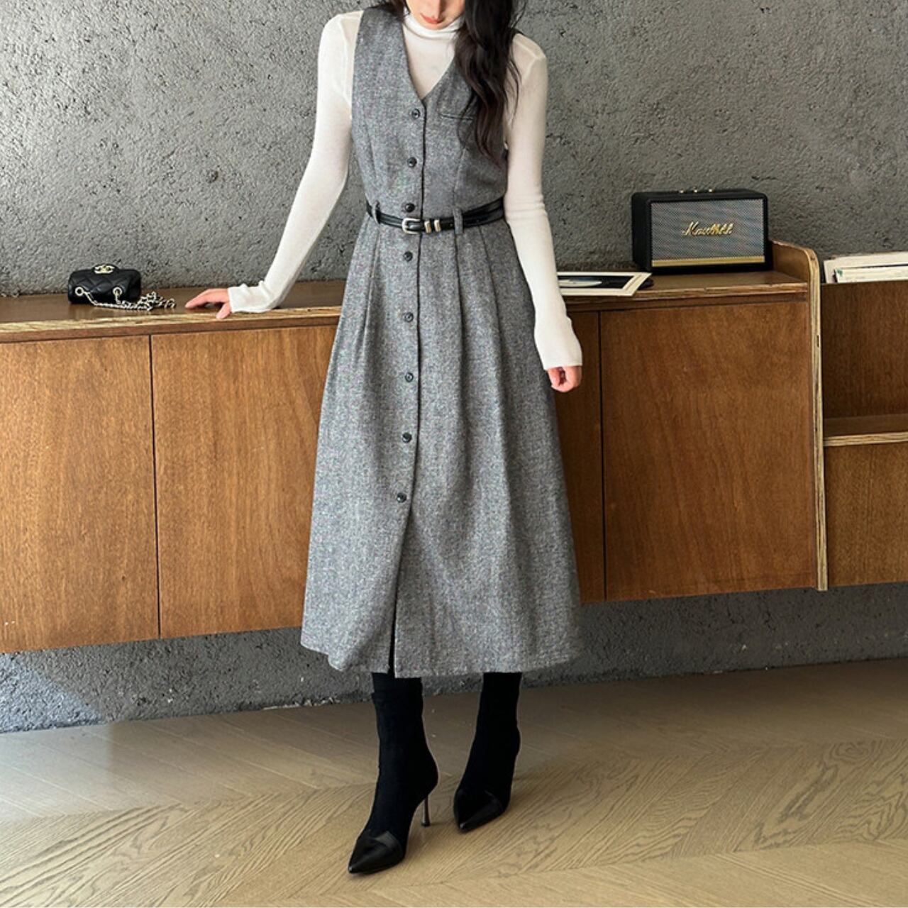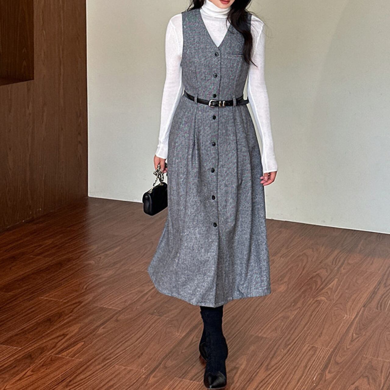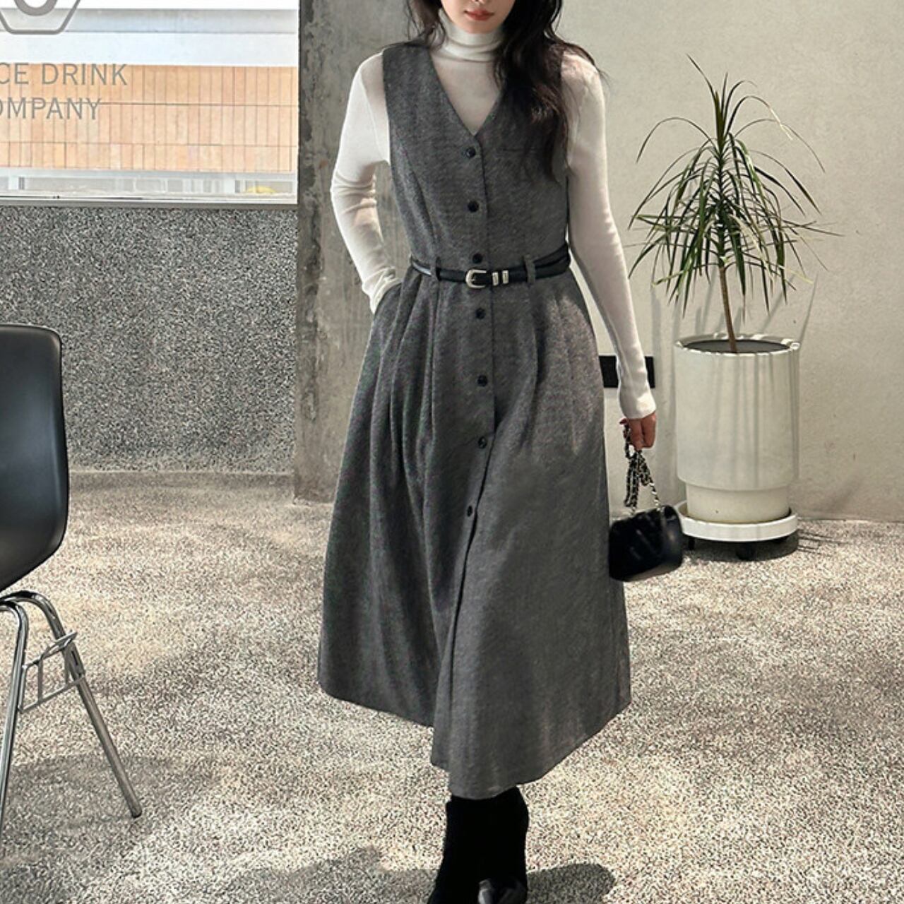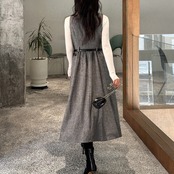 00004 ボタンフロント ミモレ丈 ノースリーブ ワンピース