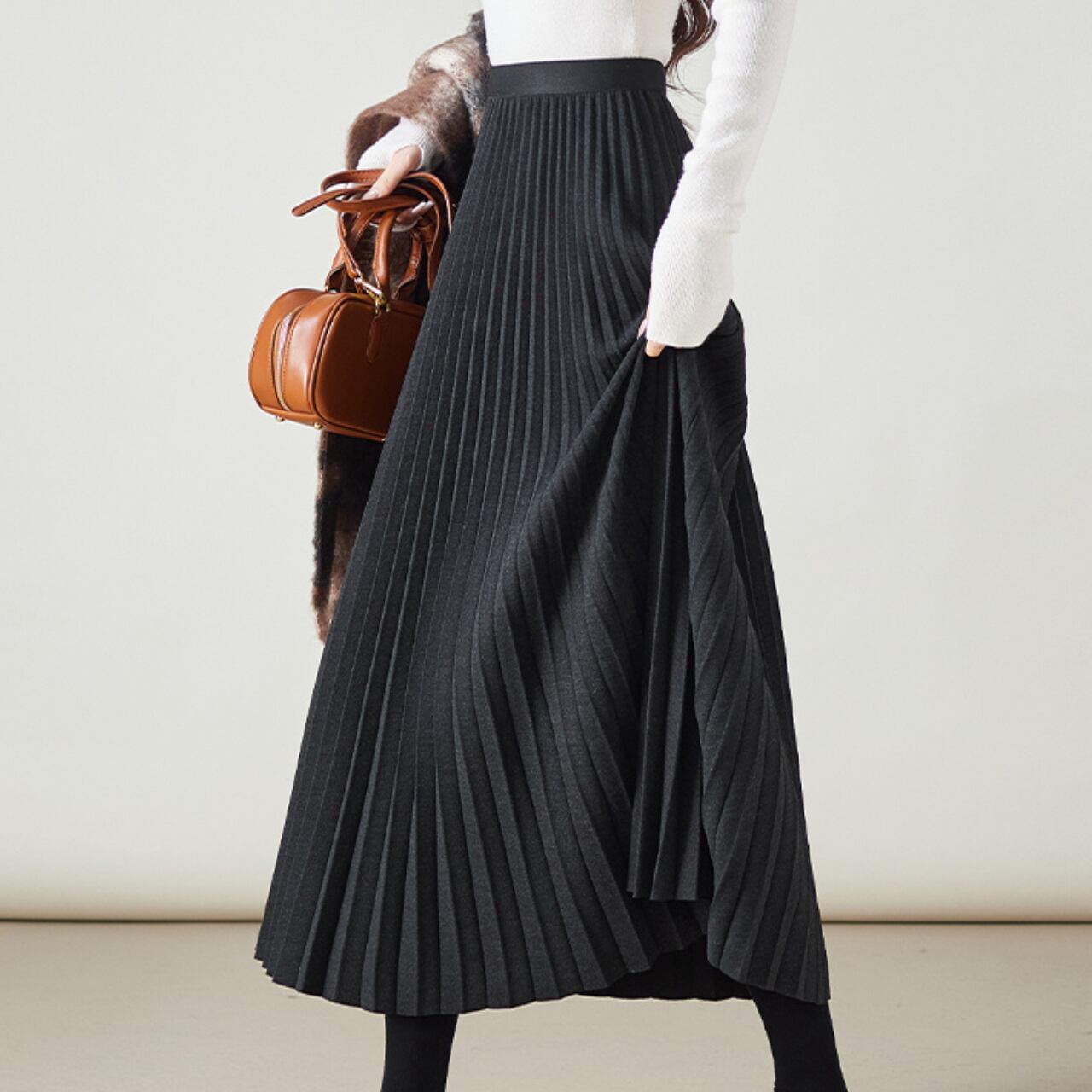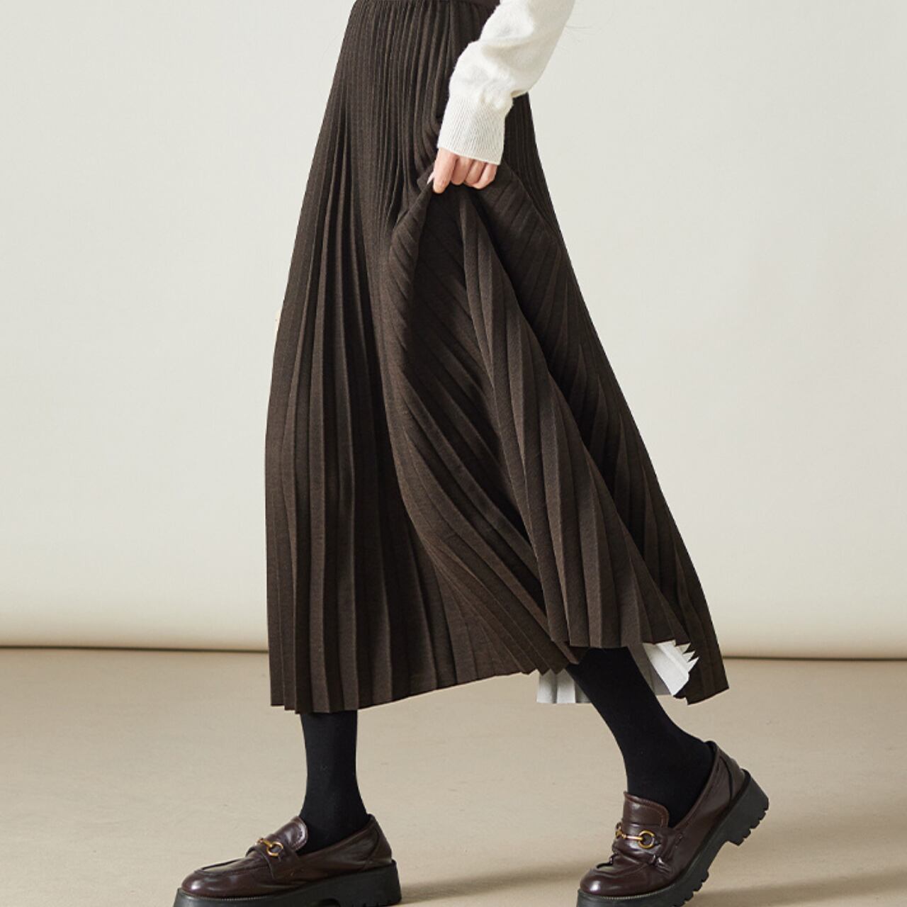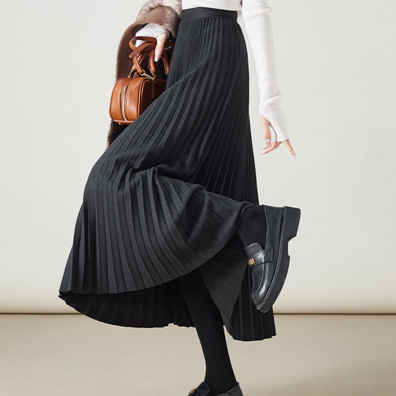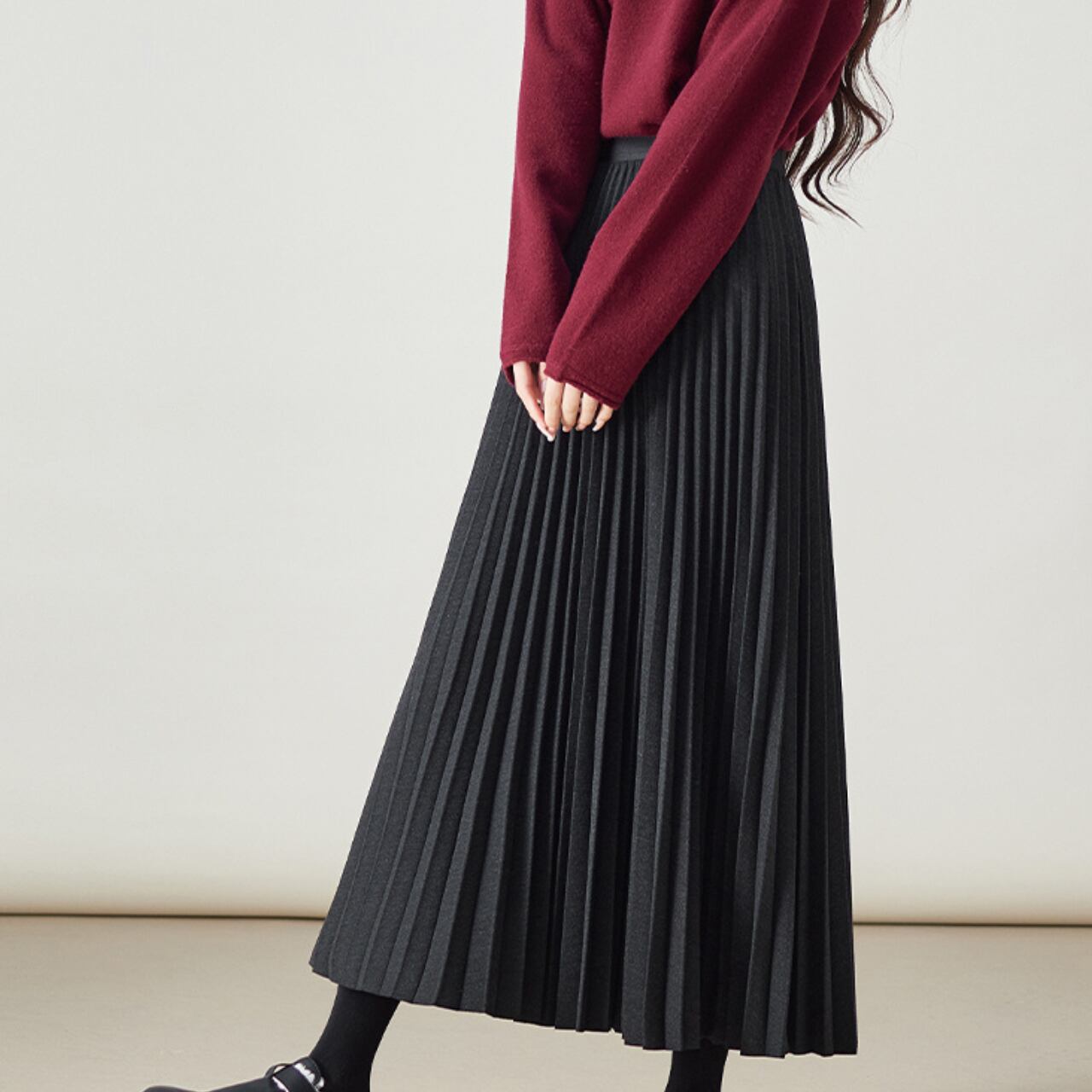 柔らかく、プリーツのあるスカートは
