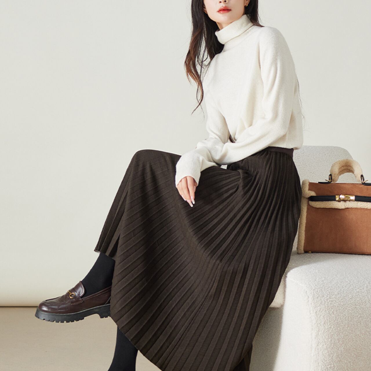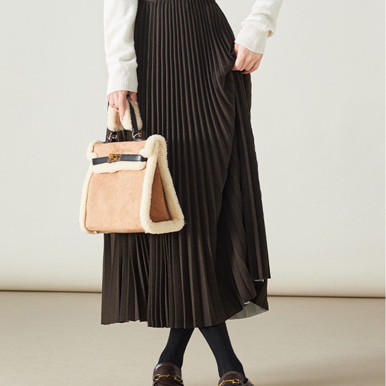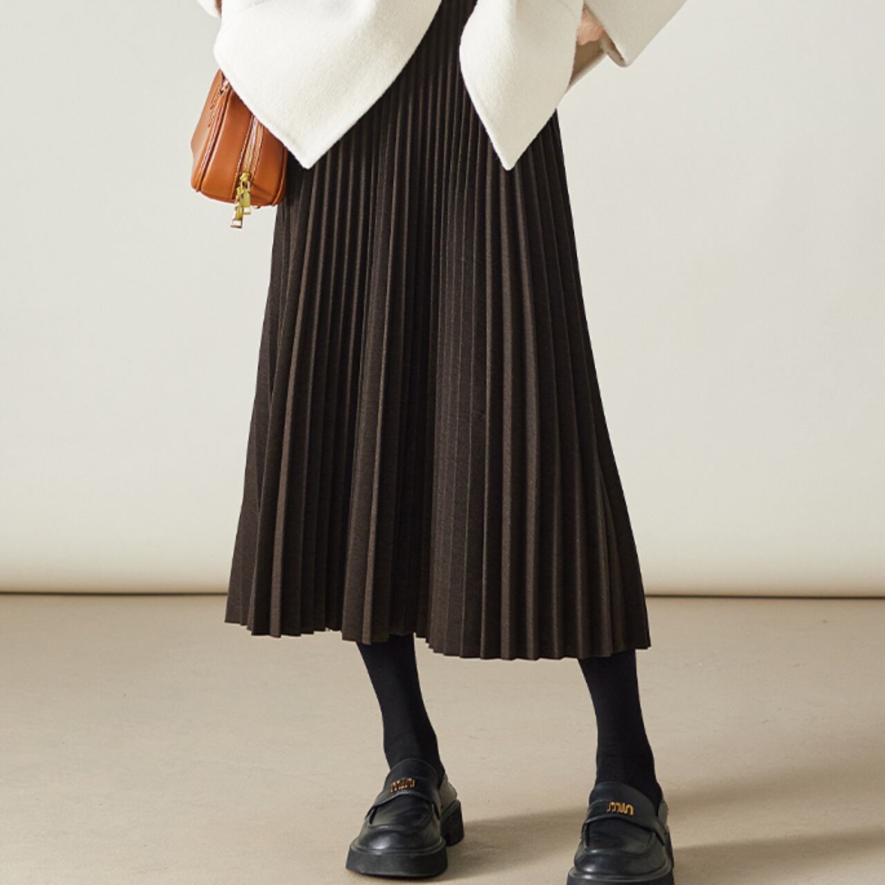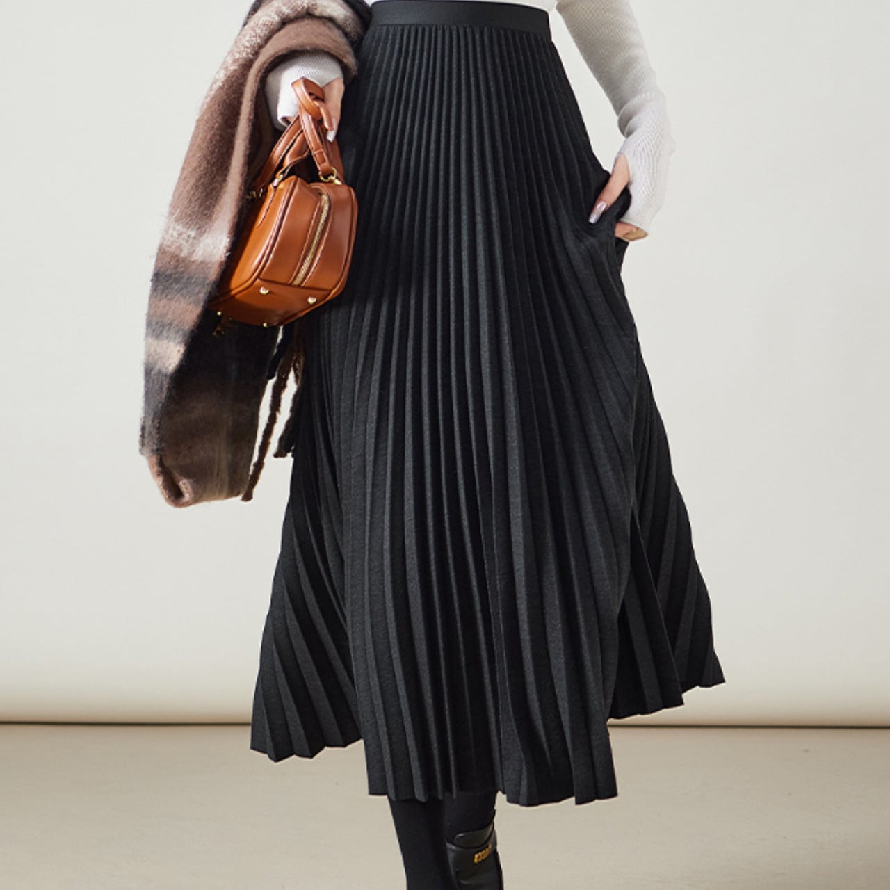 柔らかく、プリーツのあるスカートは