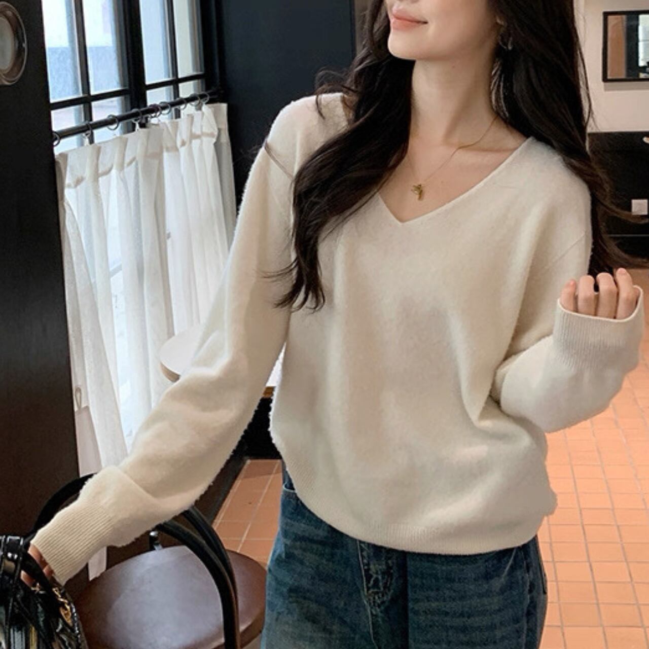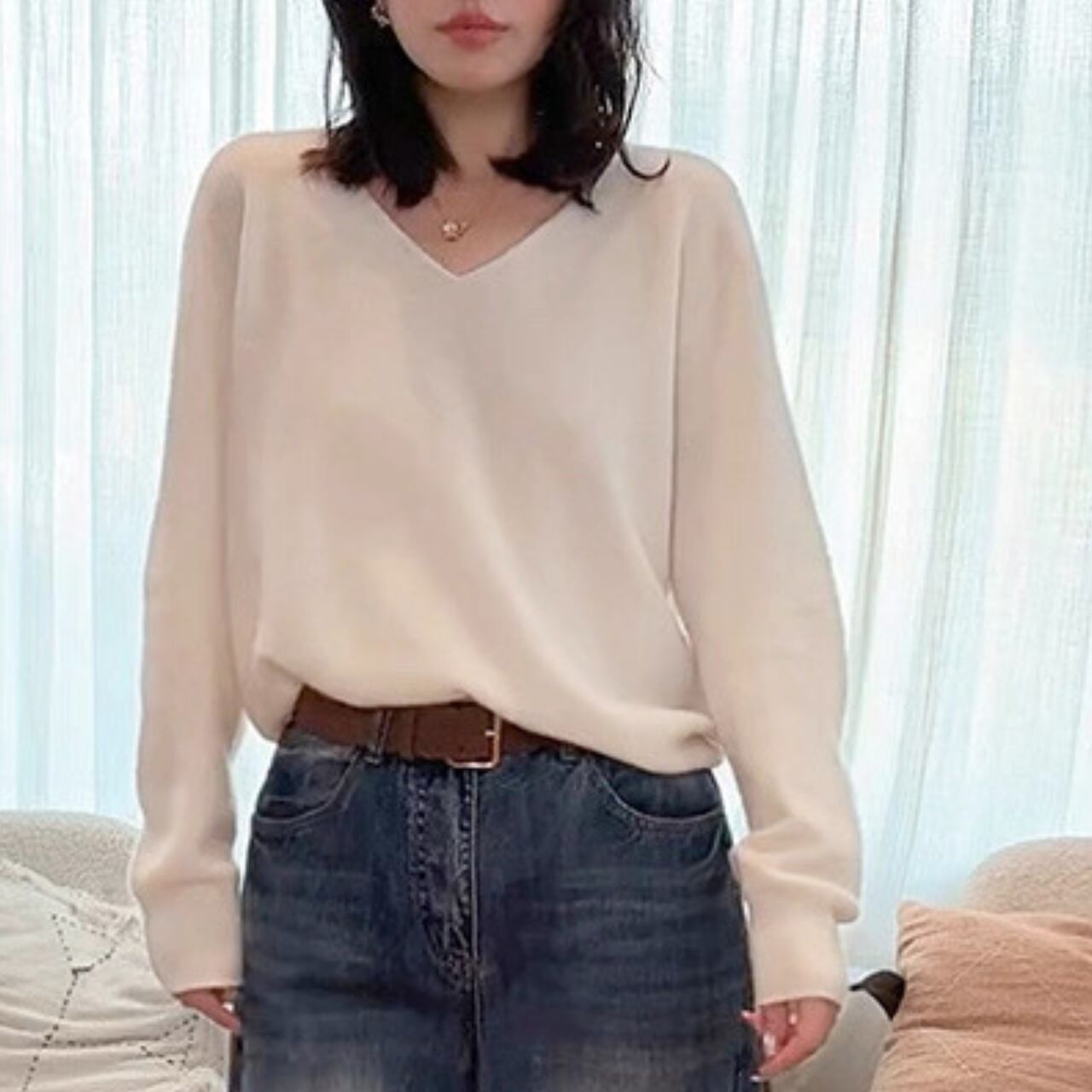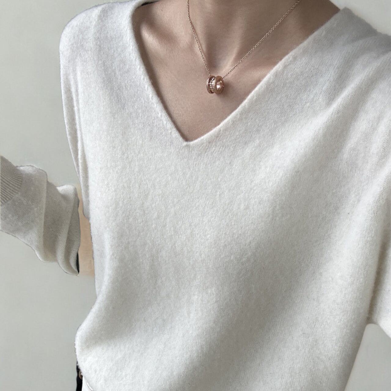 上品な抜け感を演出するVネックニット。
