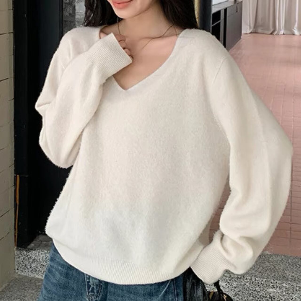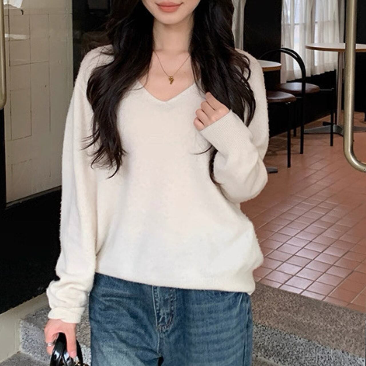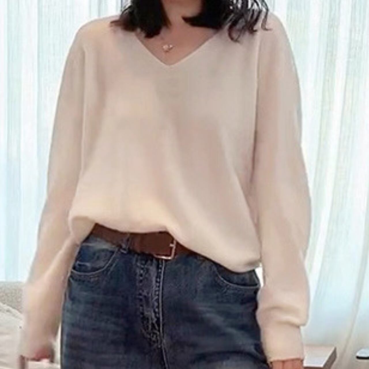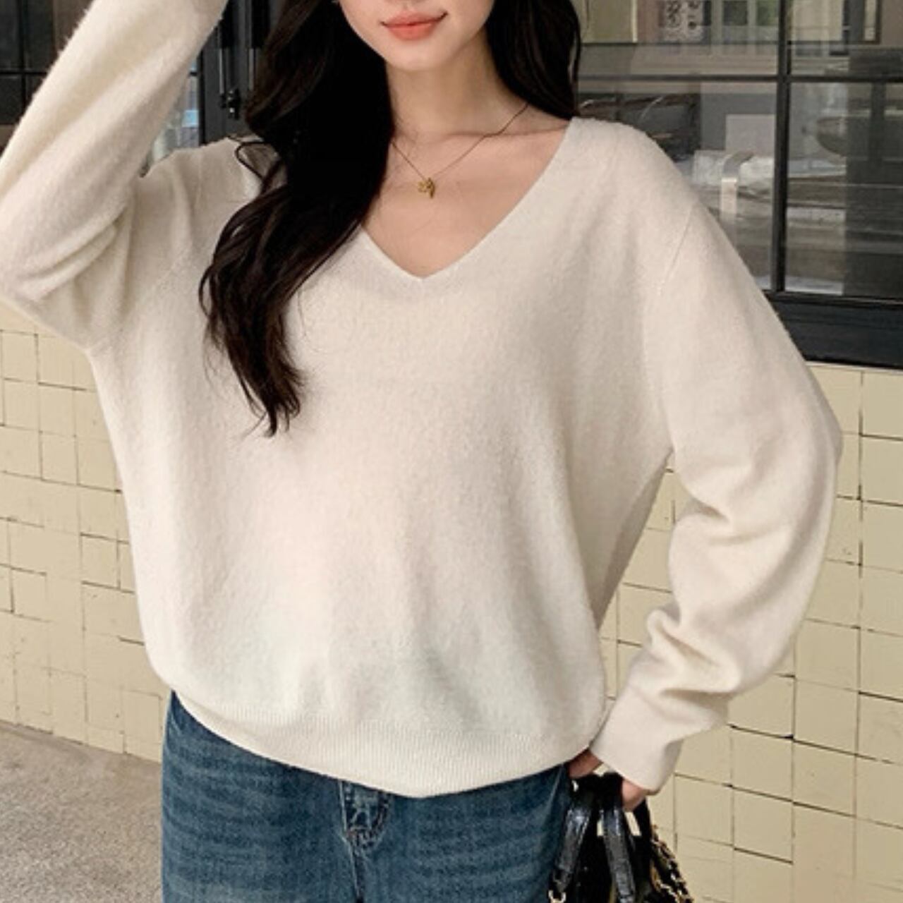 上品な抜け感を演出するVネックニット。