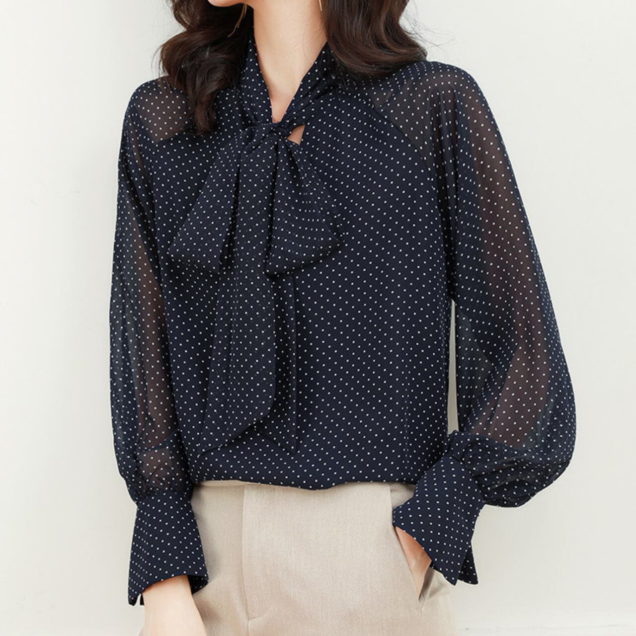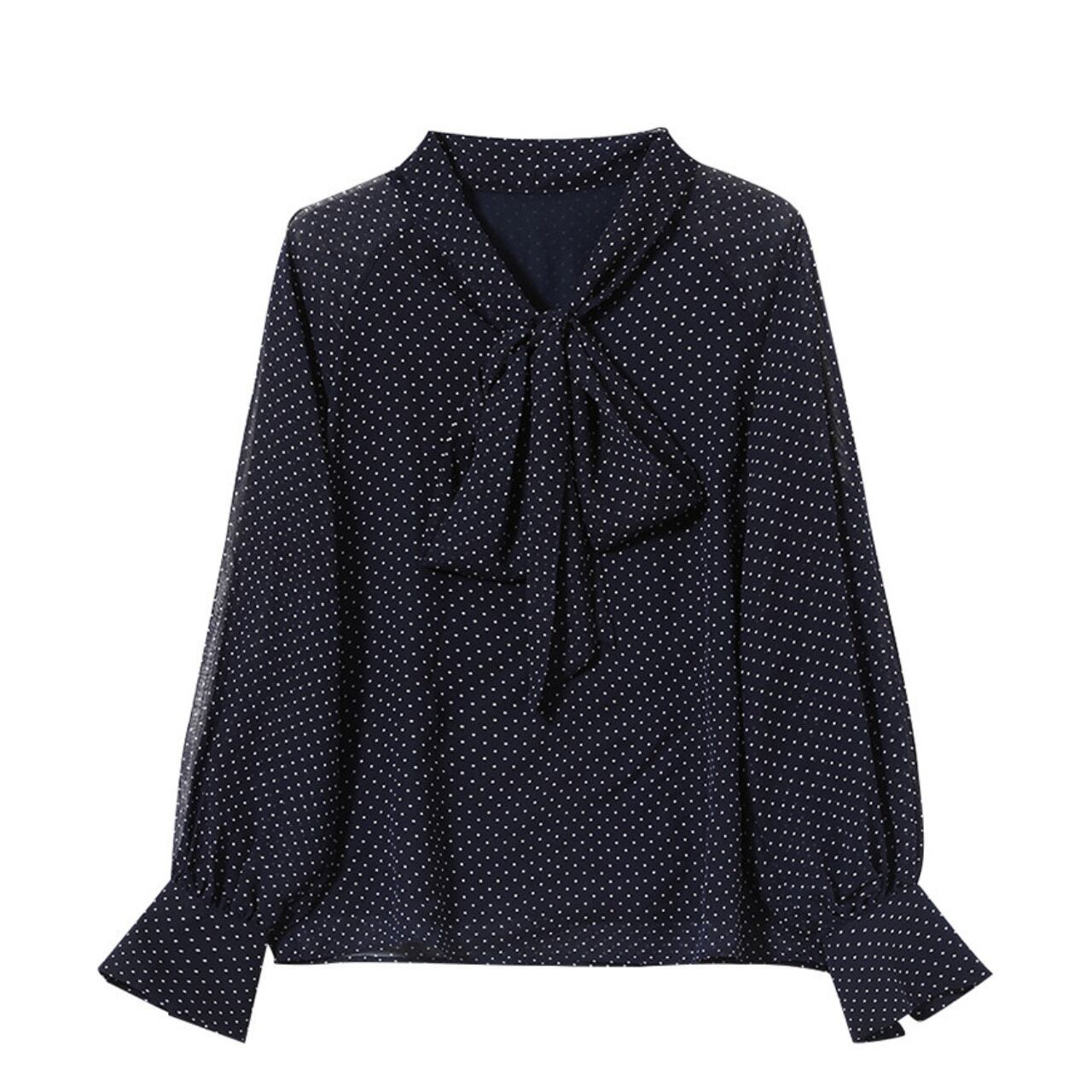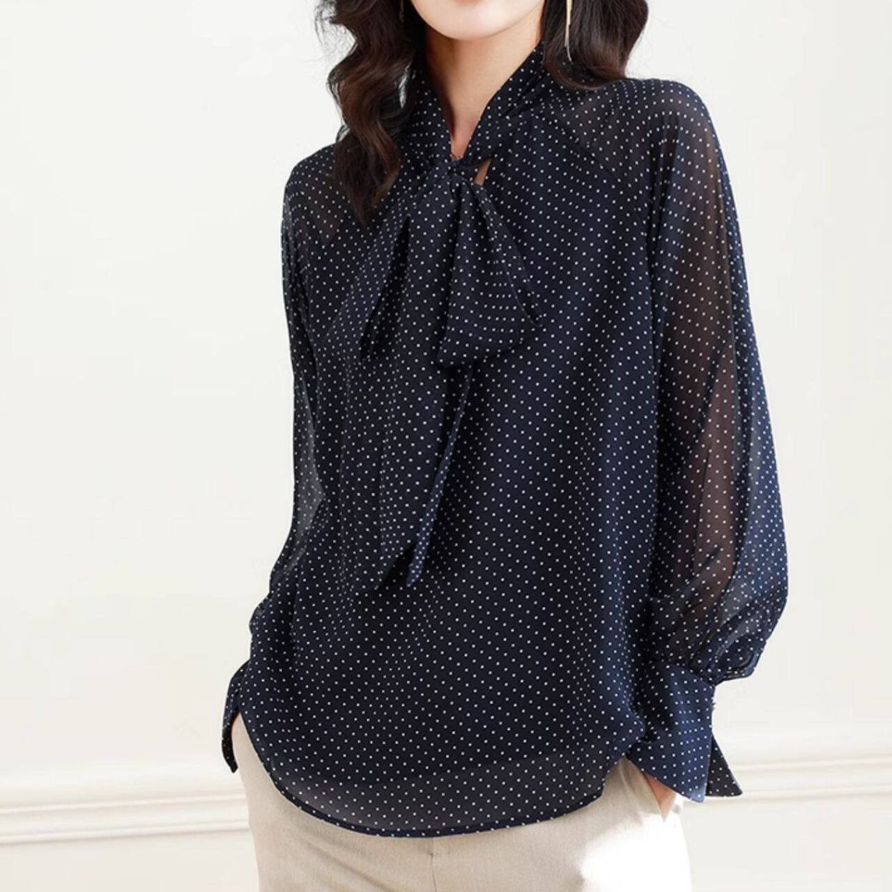 00033 ボウタイ 長袖 ドット柄 ブラウス