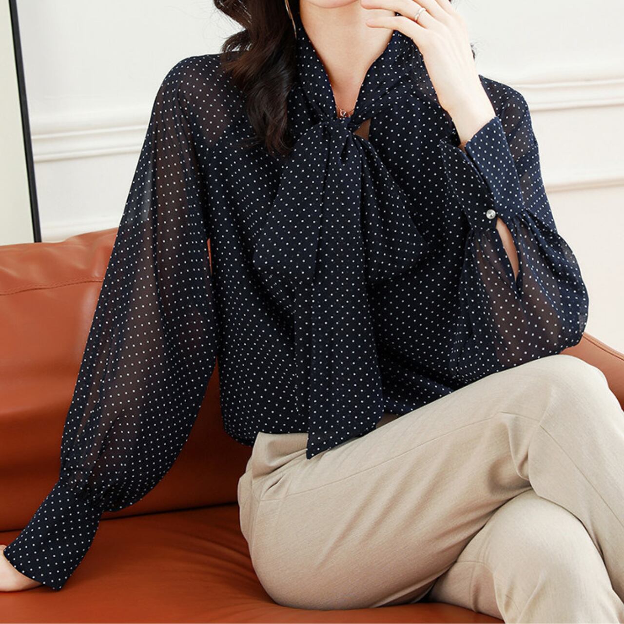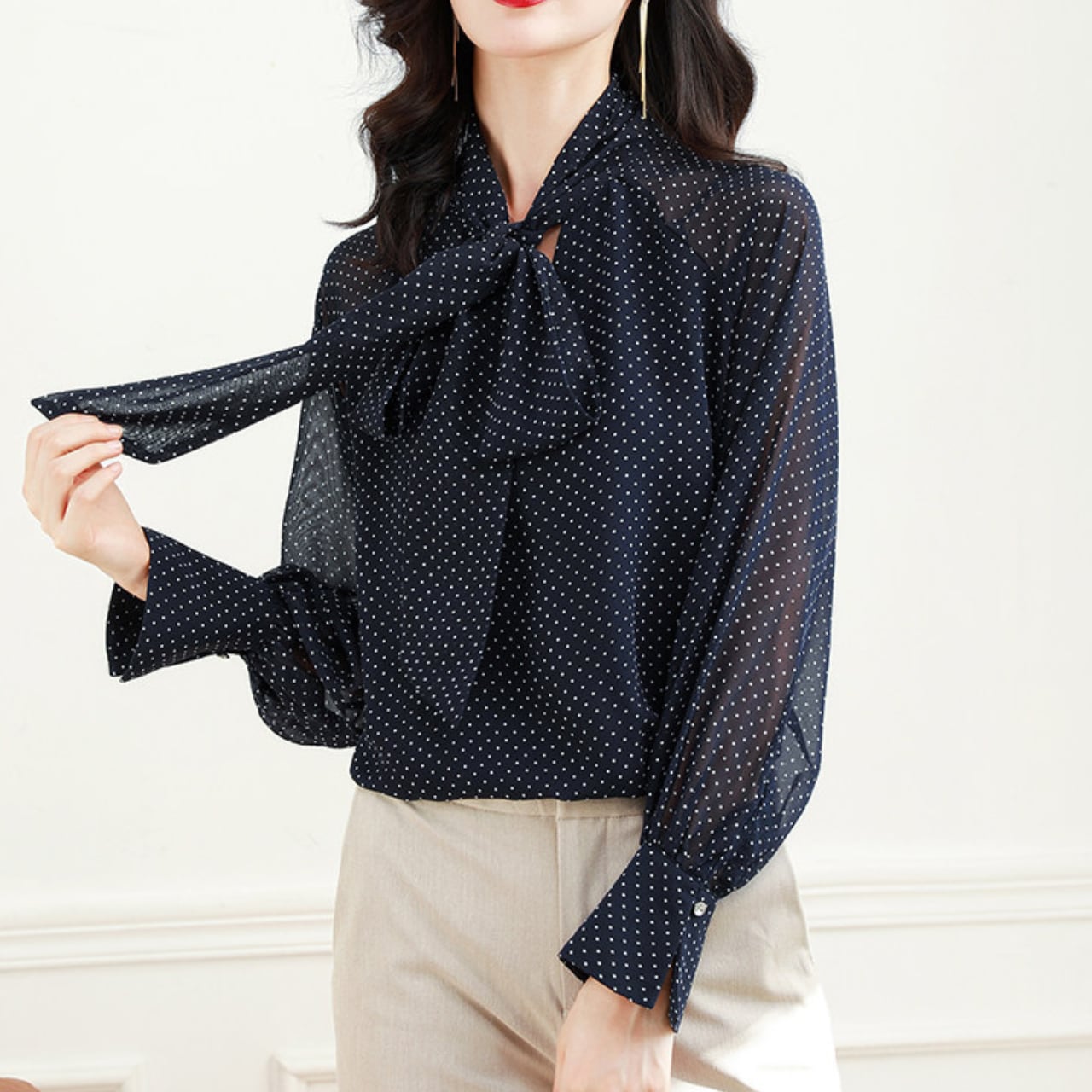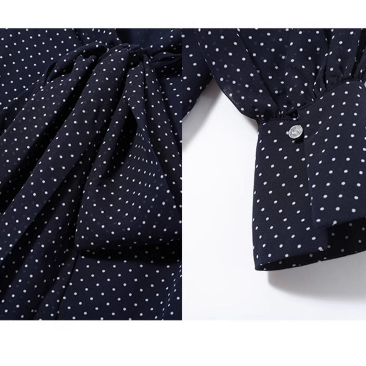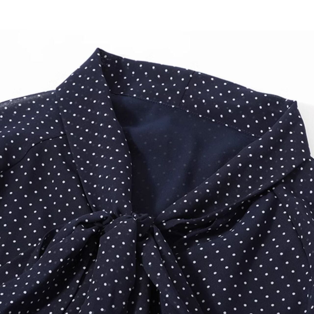 00033 ボウタイ 長袖 ドット柄 ブラウス